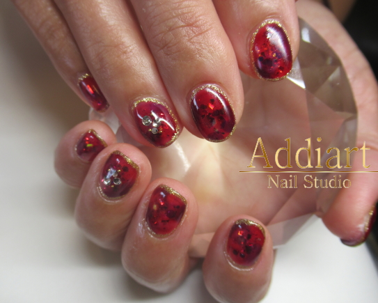ラメの上のクリアボルドーが綺麗です! 【ジェル ¥9400+税】
