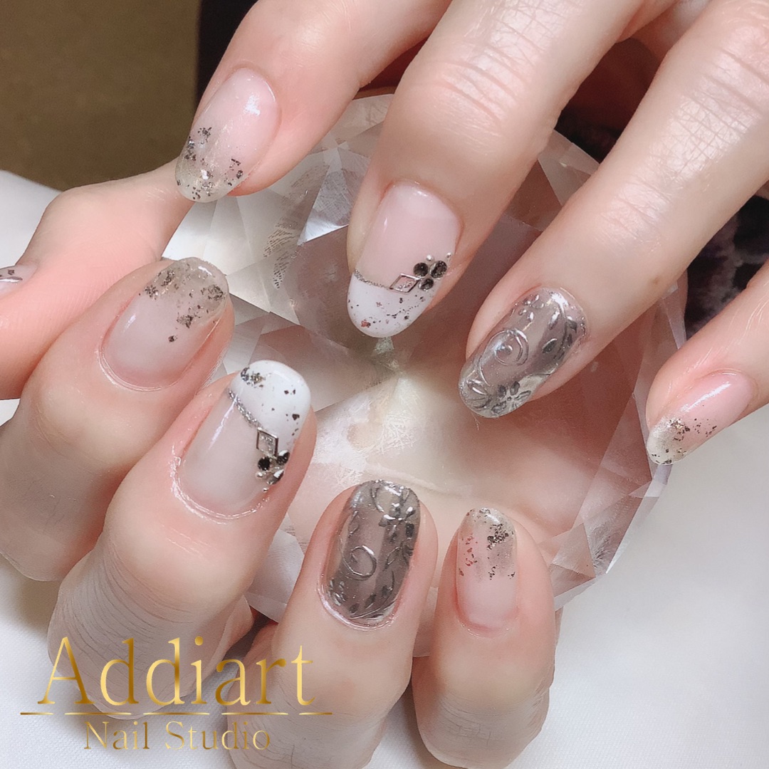 質感の違うメタリックシルバーを使い分けてます☆ 【ジェル ¥10820+税】