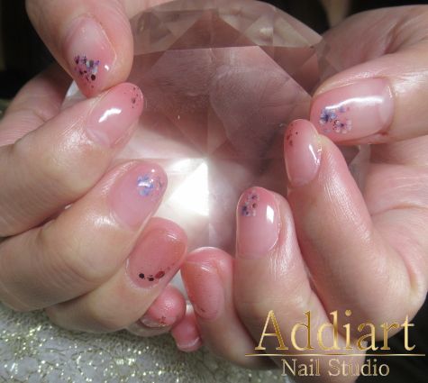 くすみカラーのベースと押し花で、秋にもおすすめデザインです! 【ジェル ¥8600+税】