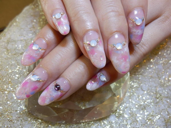 3色のタイダイ風マーブルにシェルを重ねた夏らしいデザインです☆【ジェル ¥13500+税】