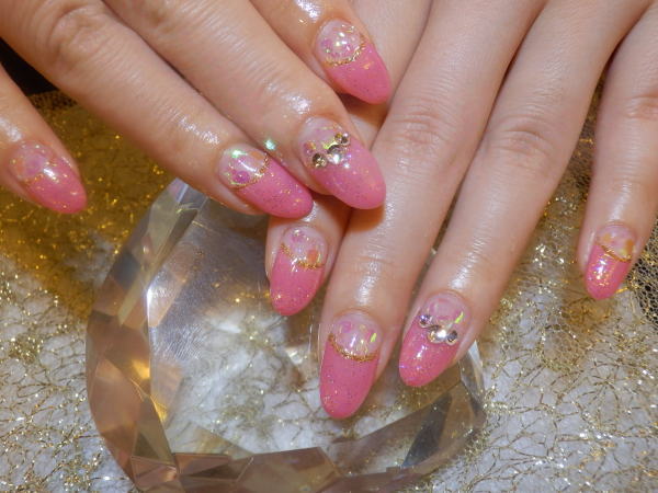 ピンクのカラーの上にラメを重ねて 根元のクリア部分にもホログラムを埋め込んだキラキラ春ネイル! 【ジェル ¥10100+税】